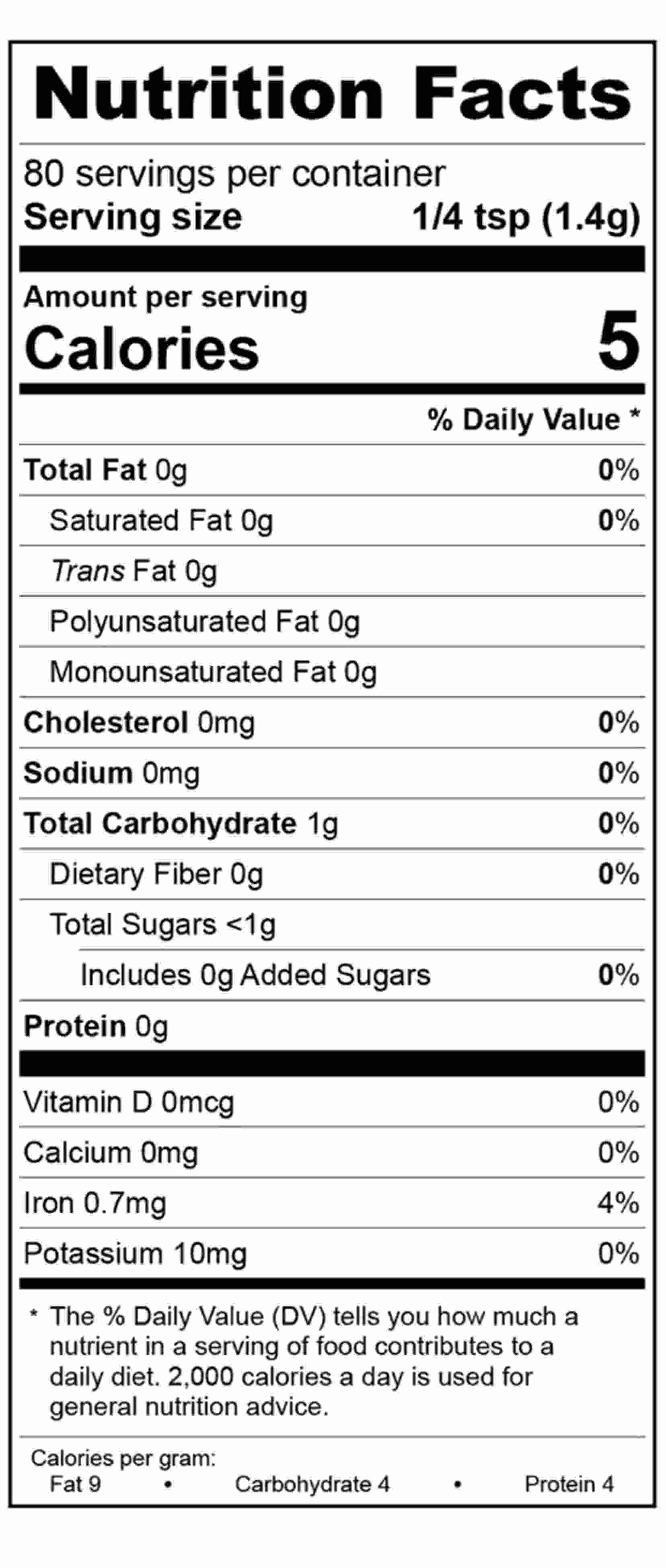 80 Servings Per Container Serving Size 1/4 tsp (1.4g) Amount Per Serving Calories 0 % Daily Value Total Fat 0g 0% Saturated Fat 0g 0% Trans Fat 0g PolyunSaturated Fat 0g MonounSaturated Fat 0g Cholesterol 0mg 0% Sodium 0mg 0% Total Carbohydrate 0% Dietary Fiber 0g 0% Total Sugars <1g Includes 0g Added Sugars 0% Protein 0g Vitamin D 0mcg 0% Calcium 0mg 0% Iron 0.7mg 4% Potassium 10mg 0%